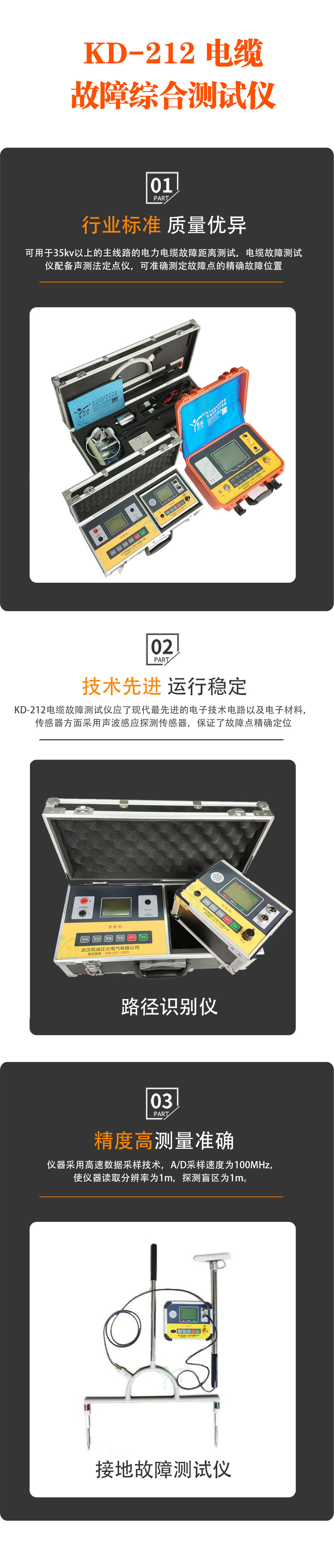 KD-212電纜故障測試儀是由KD-212路徑信號發(fā)生器、KD-212路徑定位接受機、感應式探頭、電位差式探測架等組成。電纜尋跡及故障定位儀是光纜、電纜故障定位測試的專用儀表,適用測試對象為具有金屬導體(線對、護層、屏蔽層)的各種光纜、電纜。其主要功能為對地絕緣不良點的定位測試,線纜路徑的探測以及線纜埋深的測試。有線通信的暢通和電力的輸送有賴于電纜線路的正常運行。一旦線路發(fā)生障礙,不及時查出故障并迅速予以排除,就會造成很大的經(jīng)濟損失和不良的社會影響。因而,電纜故障測試儀是維護各種電纜的重要工具。電纜故障智能測試儀采用了多種故障探測方式,應用當代較新的的電子技術(shù)成果和器件,采用計算機技術(shù)及特殊性電子技術(shù),結(jié)合本公司長期研制電纜測試儀的成功經(jīng)驗而推出的高科技,智能化,功能全的產(chǎn)品。