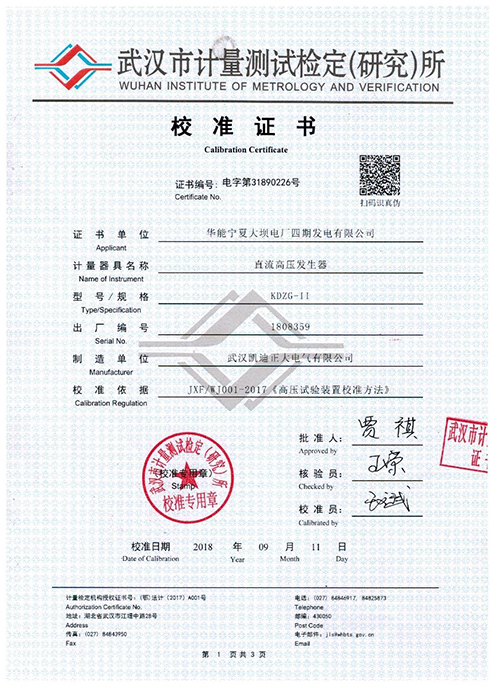 武漢凱迪正大KDZG-II直流高壓發生器校準證書