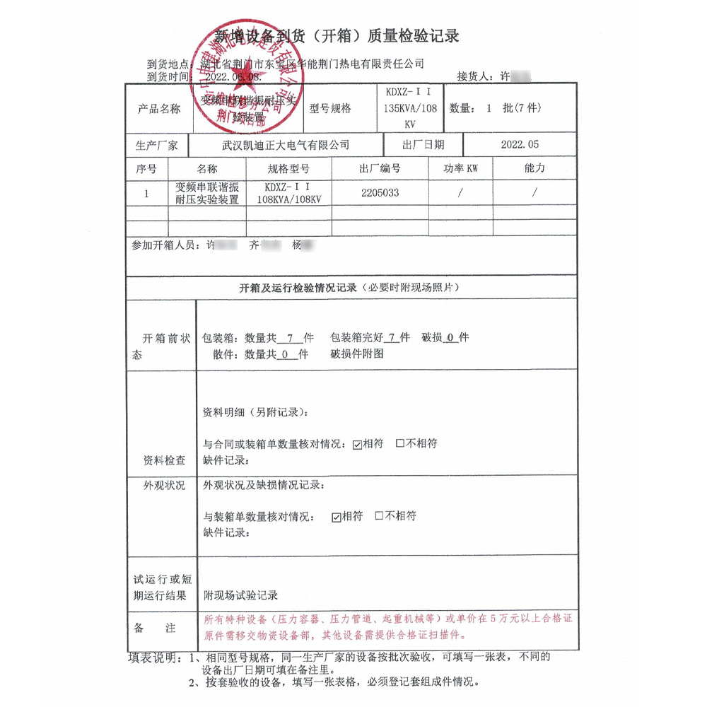 2022年6月初,華能荊門熱電有限公司采購凱迪正大電氣一批熱電廠電氣試驗設備,其中KDXZ-135kvA/108kV變頻串聯諧振耐壓試驗裝置已經順利到貨,實發(fā)數量7件,實收數量7件。由中國電建湖北運維檢修公司荊門項目部許工負責驗收,火紅的電抗器顏色格外顯眼。許工和齊工一起對設備進行清點,仔細對比了湖北省計量院出具的計量檢測報告,對比現場升壓試驗精度,表示認可滿意。