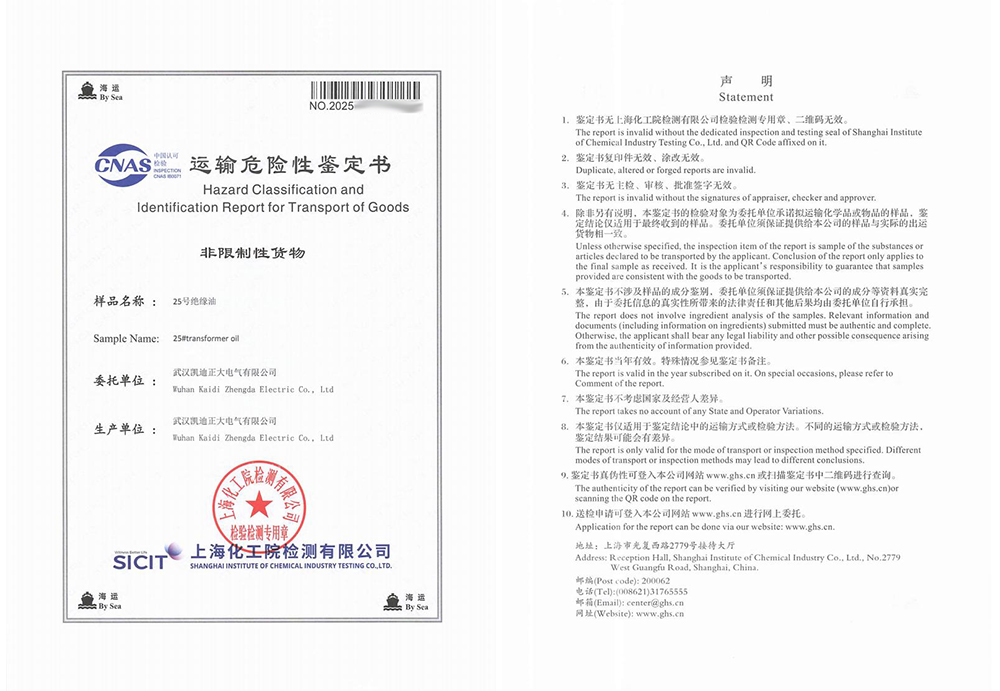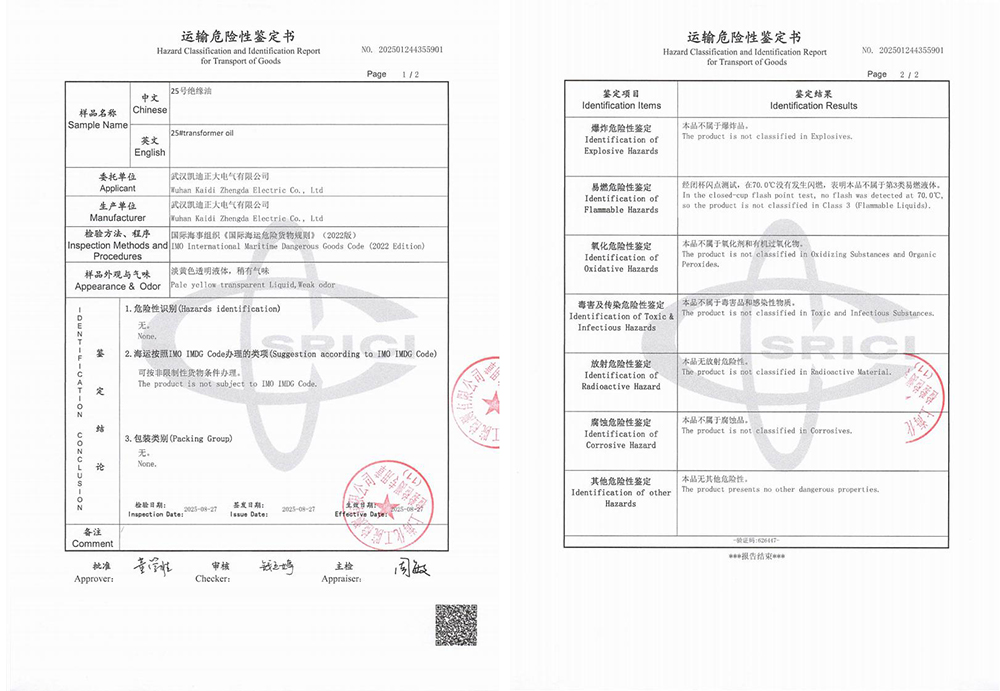 運輸危險性鑒定過程與結(jié)果詳解在國際海運中,危險品的運輸管理有著嚴(yán)格的標(biāo)準(zhǔn)與規(guī)范,油式試驗變壓器所用的絕緣油作為液體類物質(zhì),是否屬于易燃易爆危險品,需通過專業(yè)的運輸危險性鑒定予以確認(rèn)。為此,武漢凱迪正大委托上海化工院檢測有限公司對KD2675設(shè)備中使用的25號絕緣油進行了全面檢測。